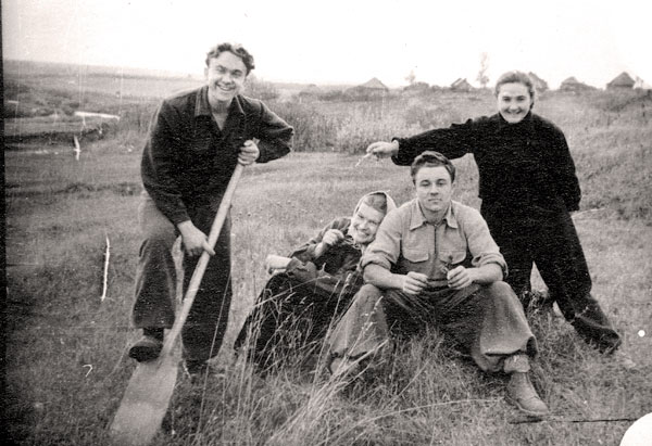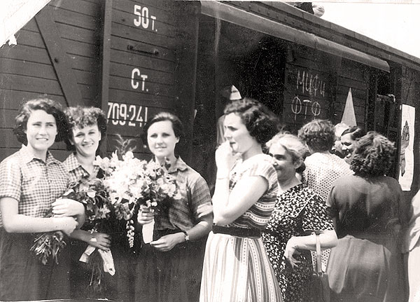 Слева направо – Л. Иорданская, Р. Ткаченко, В. Страшненкова, а Е. Щербак их провожает.